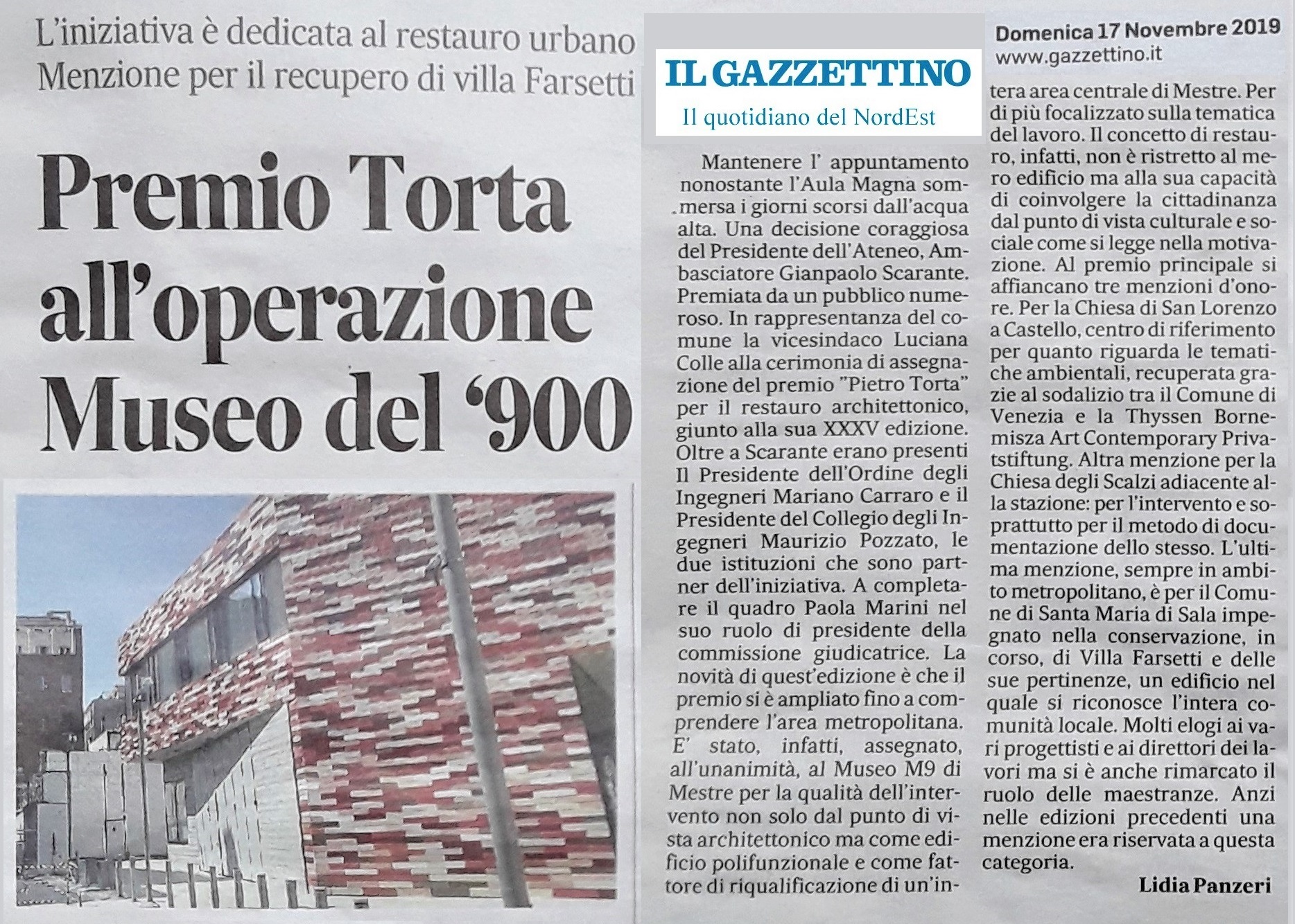 - al Comune di Santa Maria di Sala per il considerevole impegno profuso nella conservazione di Villa Farsetti – bene architettonico di grande importanza per le dimensioni e per il ruolo territoriale, avvertito come identitario dalla comunità locale – attraverso una serie di coordinati interventi di recupero dell’edificio e delle sue pertinenze, cui si è dato avvio raggiungendo già risultati apprezzabili.