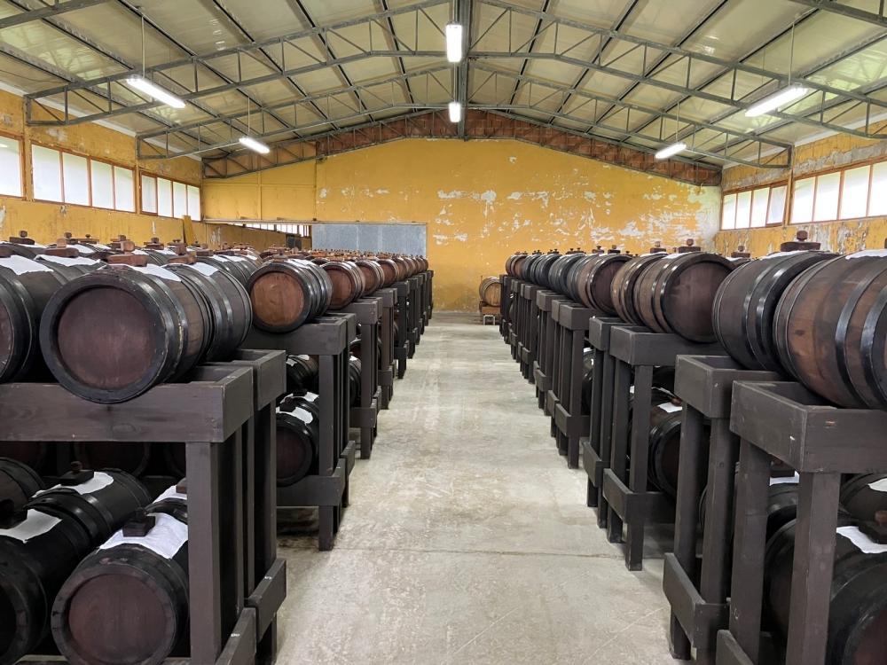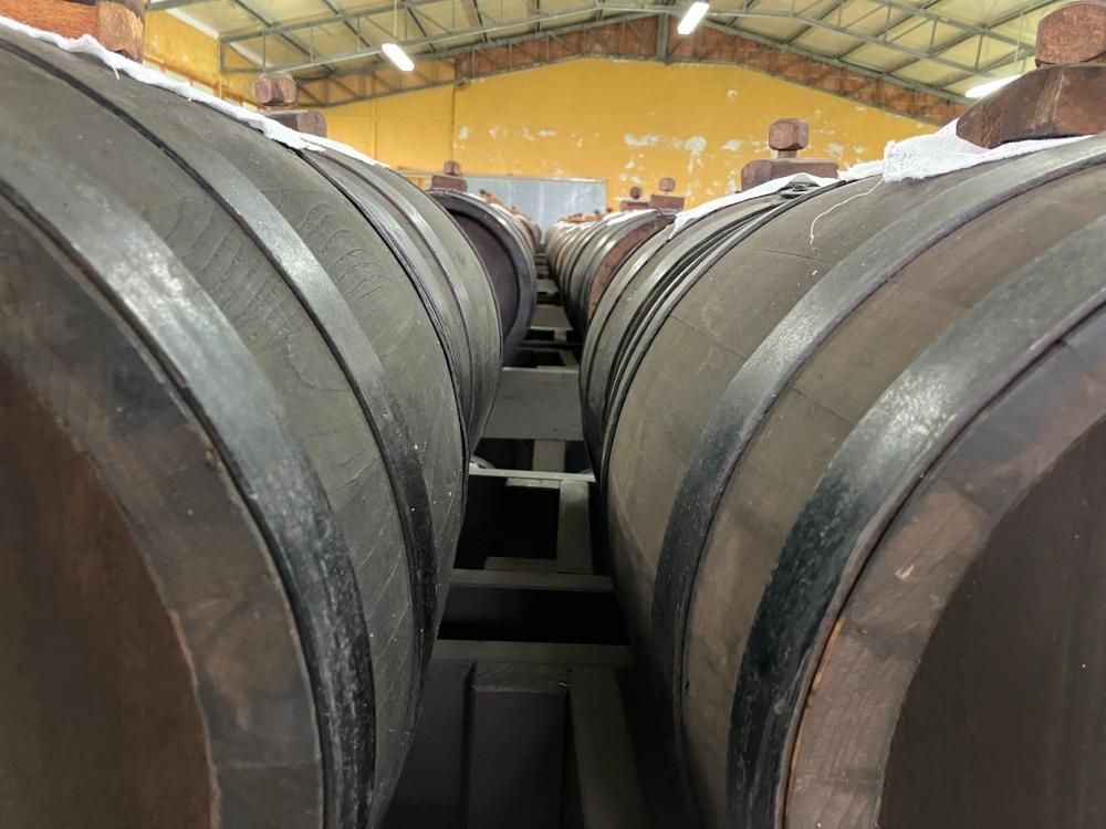 Le botti per la stagionatura e l’invecchiamento trovano spazio all’interno di un grande capannone, ordinate per tipo e dimensione. Non sono tappate, ma il foro superiore è coperto da una garza, che consente l’evaporazione, per cui il contenuto diminuisce gradualmente e le botti vengono rabboccate periodicamente. Da 130 Kg di uva si ottengono soltanto 2 litri di aceto sopraffino.