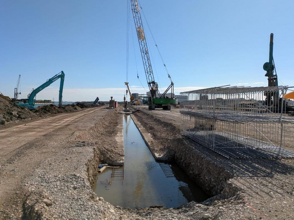 La prima fase di realizzazione del nuovo terminal container prevede l’arretramento del canale per una fascia di circa 35 m rispetto all’attuale banchina. Tale arretramento richiede la formazione di una nuova banchina e delle vie di corsa delle future gru per lo sbarco dei container, ottenute mediante la costruzione di diaframmi in calcestruzzo armato.