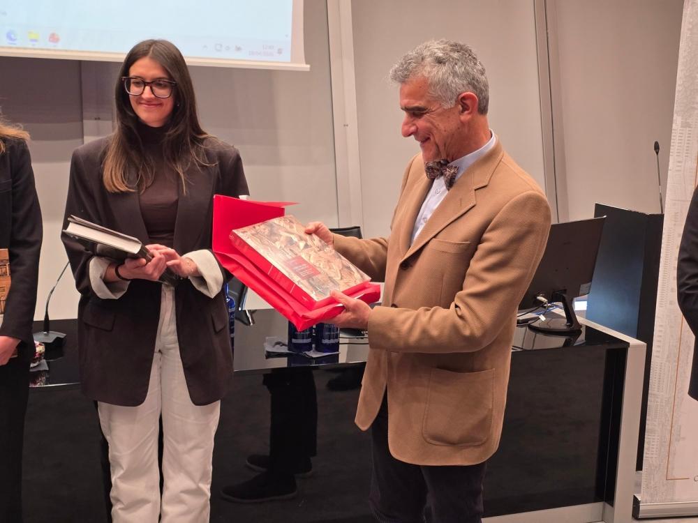 Gli ingegneri Giacomo Sarti e Giulia Caprari ricevono un volume dal Presidente Sandro Boato.
