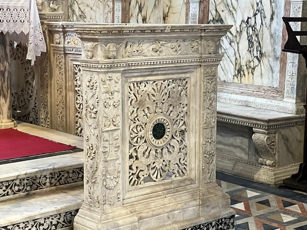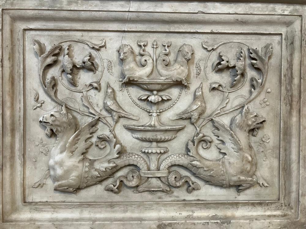 Da notare le straordinarie decorazioni scultoree intorno all’altare, che rimandano ai simboli del paganesimo.