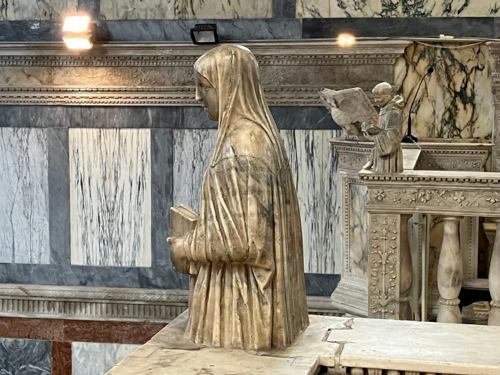 Il presbiterio è delimitato da due balaustre laterali, che terminano con due amboni, soluzione architettonica piuttosto rara. Appoggiate sul pavimento sotto la balaustra, due statue marmoree raffigurano San Francesco e Santa Chiara.
