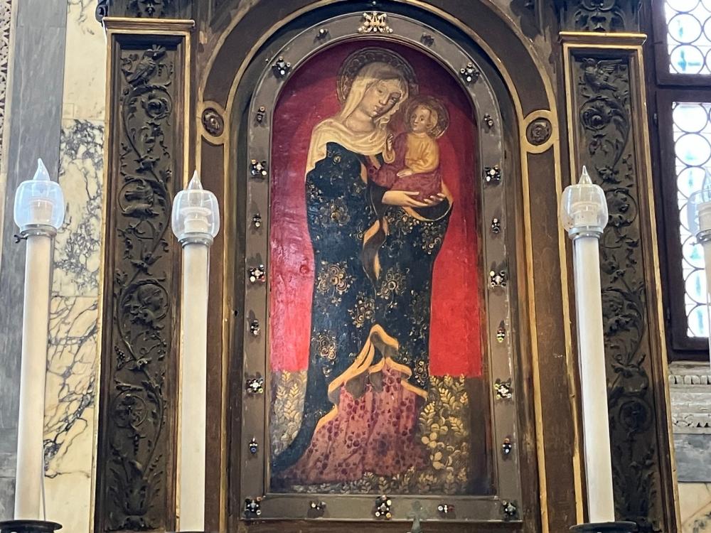 Ma entrando nella chiesa, la semplicità della navata, senza altari laterali, indirizza la vista verso il magnifico presbiterio: l’altare è situato su una struttura elevata alla quale si accede attraverso una scalinata di quindici gradini. Sull’altare campeggia il dipinto della Madonna dei Miracoli, raffigurante la Vergine vestita con un mantello blu, che tiene in braccio il bambino, su uno sfondo di prati fioriti.