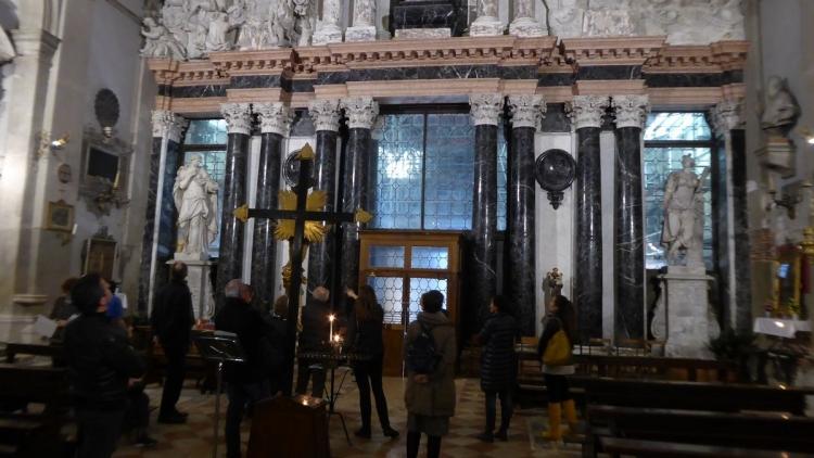 La nostra bravissima guida, Paola, che ringraziamo, partendo dalla stupenda facciata esterna, ci ha condotto in un percorso all'interno comprendente una serie di piccole e grandi gemme: il portico delle colonne e le sale capitolare e albergo con la mostra in Sala Capitolare su "Arte Fede Medicina nella Venezia di Tintoretto" e la chiesa di San Lazzaro dei Mendicanti.