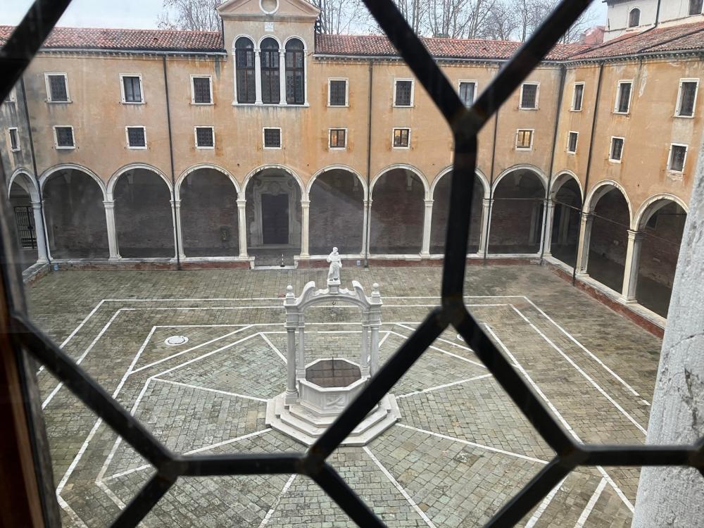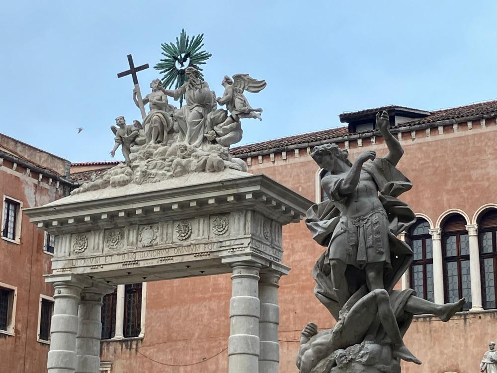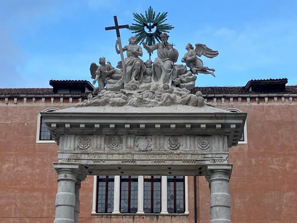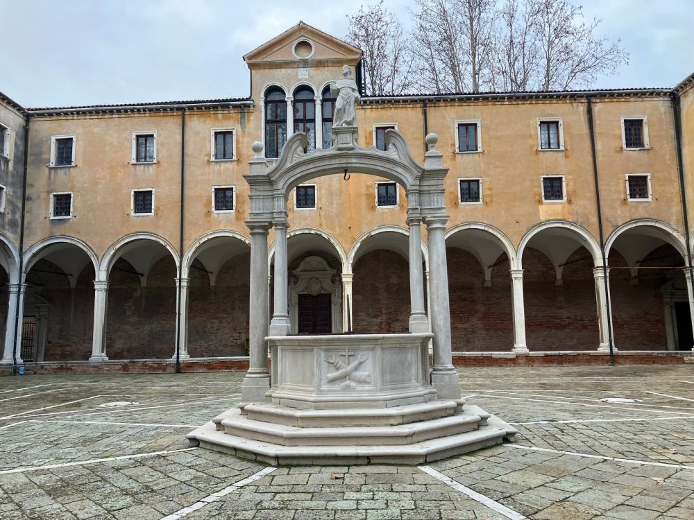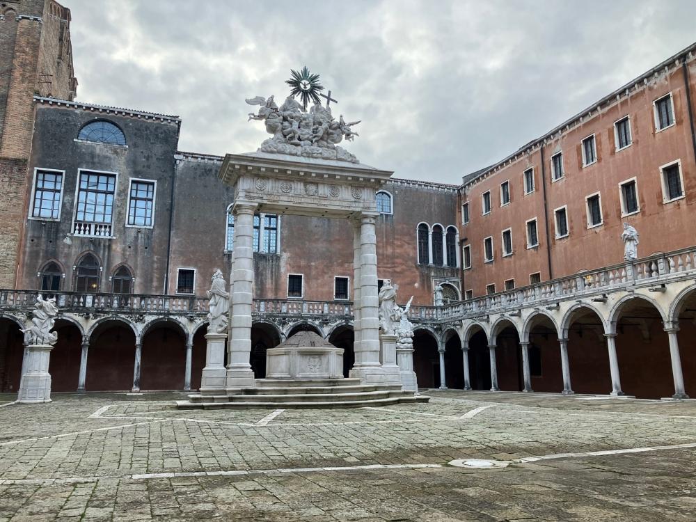 Successivamente accediamo al primo chiostro, detto Chiostro della Trinità dal nome della grande scultura che sovrasta il pozzo centrale. Il pozzo, come negli altri campi veneziani, raccoglieva le acque piovane in una cisterna sotterranea, che venivano convogliate anche dai tetti e dalle terrazze attraverso una serie di doccioni, e l’acqua era a disposizione dei cittadini, che potevano approvvigionarsi in questo chiostro. Il cortile è ornato da diverse statue: quelle di San Pietro e San Marco fiancheggiano l’arco che sovrasta il pozzo, e agli angoli del campo sono situate le statue degli Arcangeli Michele, Gabriele e Raffaele.
