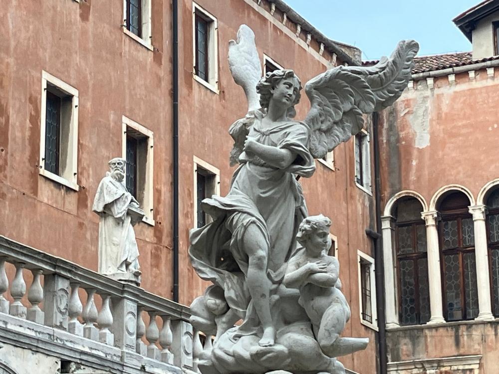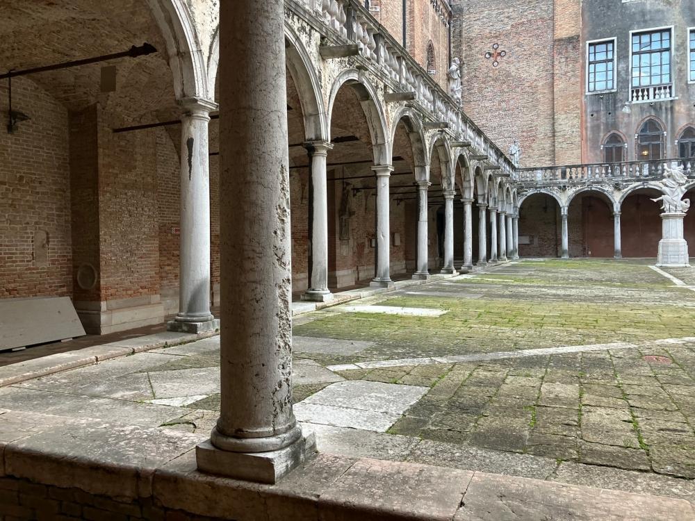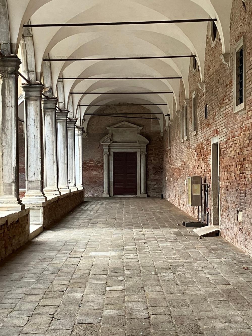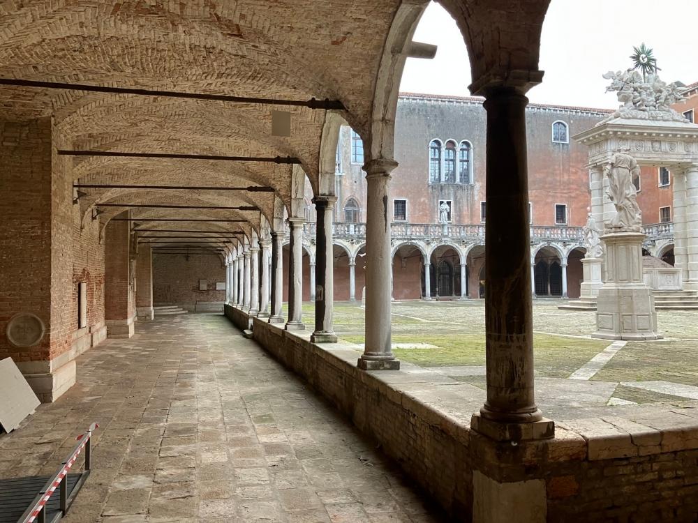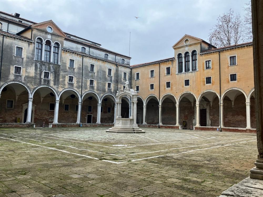 Successivamente accediamo al primo chiostro, detto Chiostro della Trinità dal nome della grande scultura che sovrasta il pozzo centrale. Il pozzo, come negli altri campi veneziani, raccoglieva le acque piovane in una cisterna sotterranea, che venivano convogliate anche dai tetti e dalle terrazze attraverso una serie di doccioni, e l’acqua era a disposizione dei cittadini, che potevano approvvigionarsi in questo chiostro. Il cortile è ornato da diverse statue: quelle di San Pietro e San Marco fiancheggiano l’arco che sovrasta il pozzo, e agli angoli del campo sono situate le statue degli Arcangeli Michele, Gabriele e Raffaele.